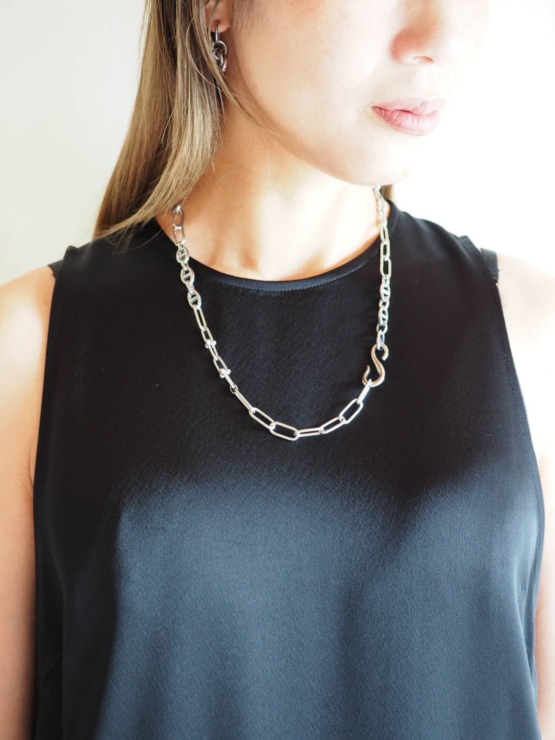 ◎大胆なクラスプデザインが特徴のBig "S" hook necklaceです。特徴的なフック形状は、どんな装いにもリーダブルに映え、特別なアクセントを加えます。このネックレスは、シンプルながらも強い存在感を持ち合わせており、多様なスタイルにしっかりフィットします。