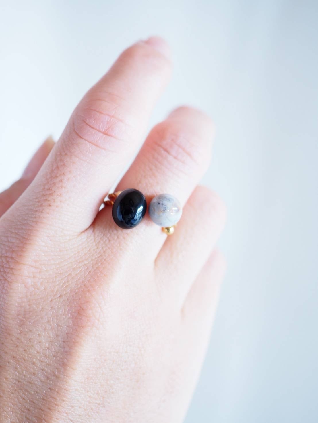◎手元を彩る特別なアイテム、Combi ring SET 1です。ブラックオニキスの深い黒と、