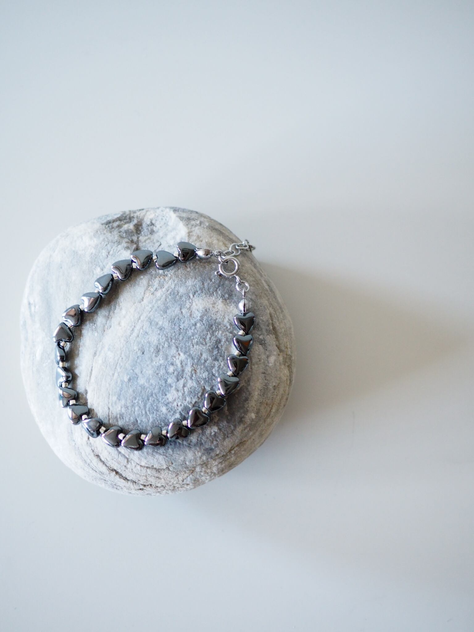 ◎独自のデザインが特徴のheart braceletです。ヘマタイトのメタリックな光沢が、シンプルながらも特別な印象を与え、身につける人の魅力を引き立てます。ハートモチーフは、かわいらしさを表現し、どんなスタイルにも優雅に調和します。このブレスレットは、日々のカジュアルコーディネートや特別なシーンにもぴったりなアイテムです!
