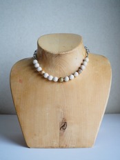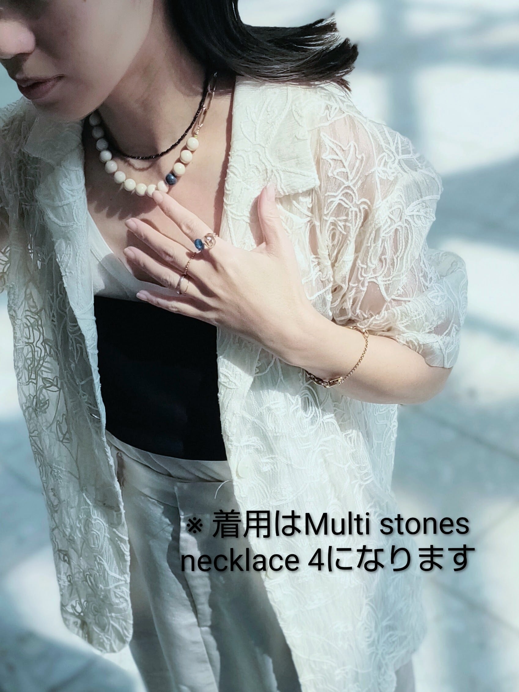 ◎あなたの魅力を引き立てる、Multi stones necklace 3です。2種の天然石が融合し、唯一無二のデザインを実現しています。複雑に入り組んだ縞模様が特徴のクレイジーレースアゲートと優しいアイボリーカラーが印象的なリバーストーンという淡いコントラストがあなたのスタイルに特別なエッセンスを加えます。このネックレスは、日常のコーディネートに華を添え、特別なシーンでも大いに活躍するアイテムです。