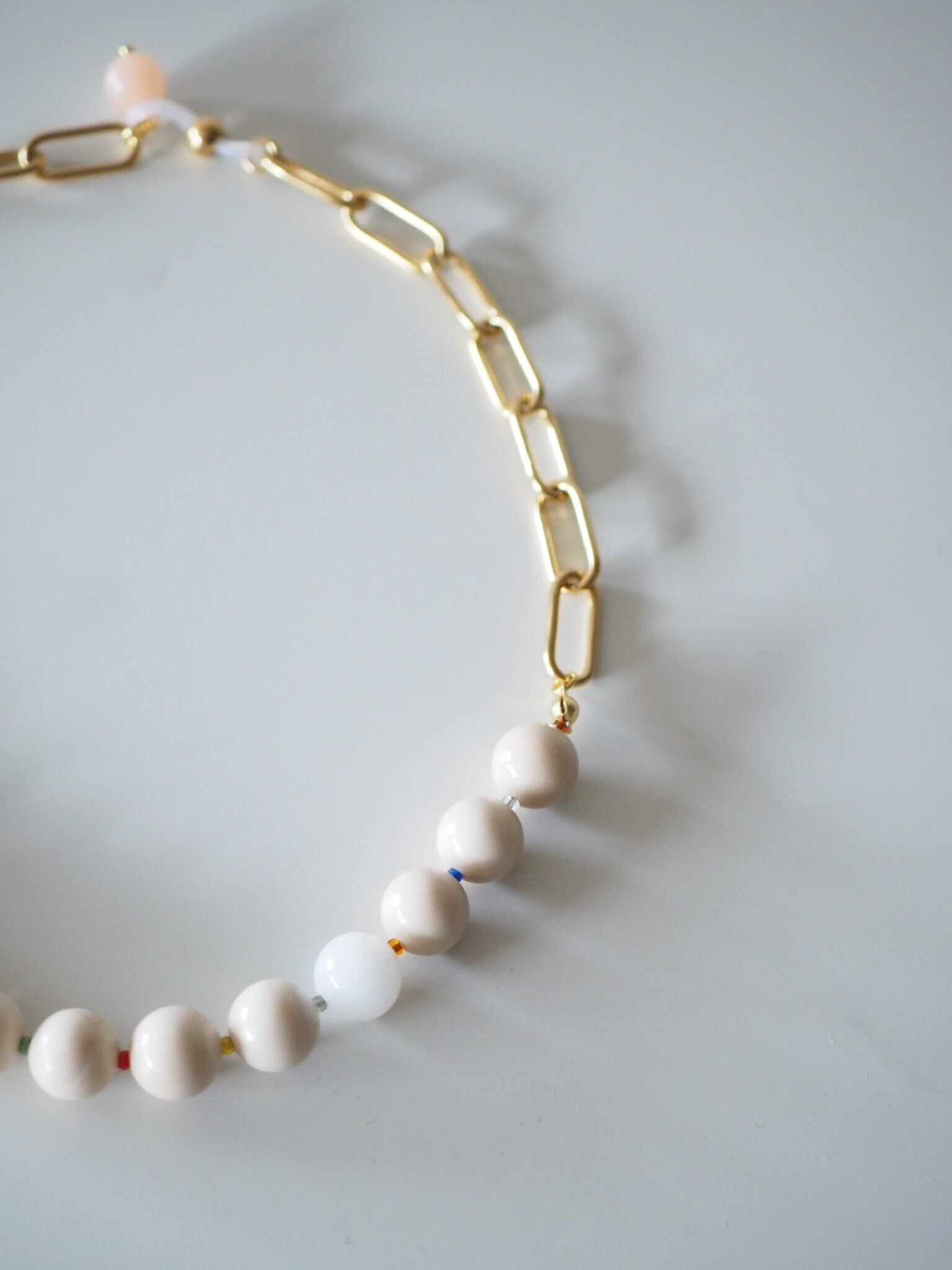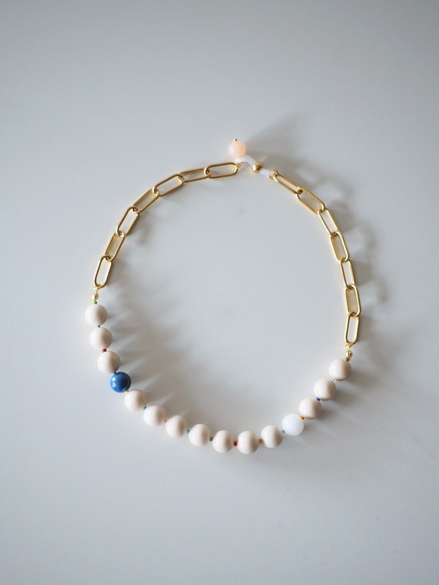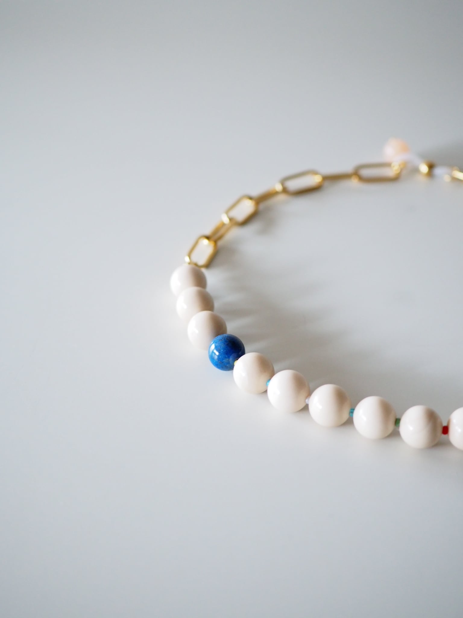 ◎あなたの魅力を引き立てる、Multi stones necklace 4です。多種多様な天然石とビンテージガラスが融合し、唯一無二のデザインを実現しています。紀元前から「聖なる石」として崇められてきたラピスラズリを差し色に各石の優しい色合いや質感がそれぞれの個性を表現し、その美しさはあなたのスタイルに特別なエッセンスを加えます。このネックレスは、日常のコーディネートに華を添え、特別なシーンでも大いに活躍するアイテムです。