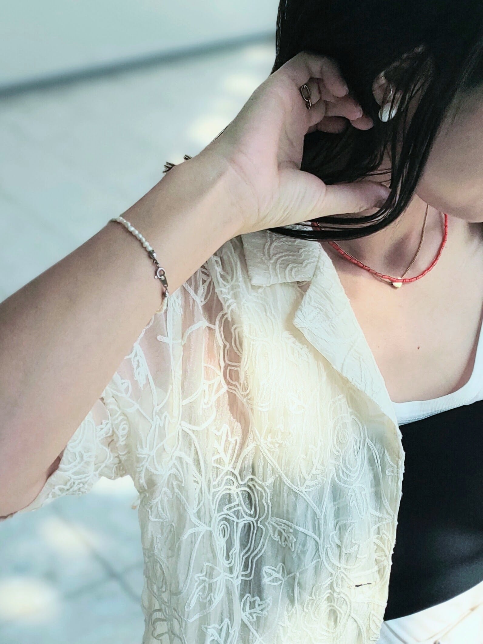 □印象的な朱赤が胸元を彩るチョーカータイプ