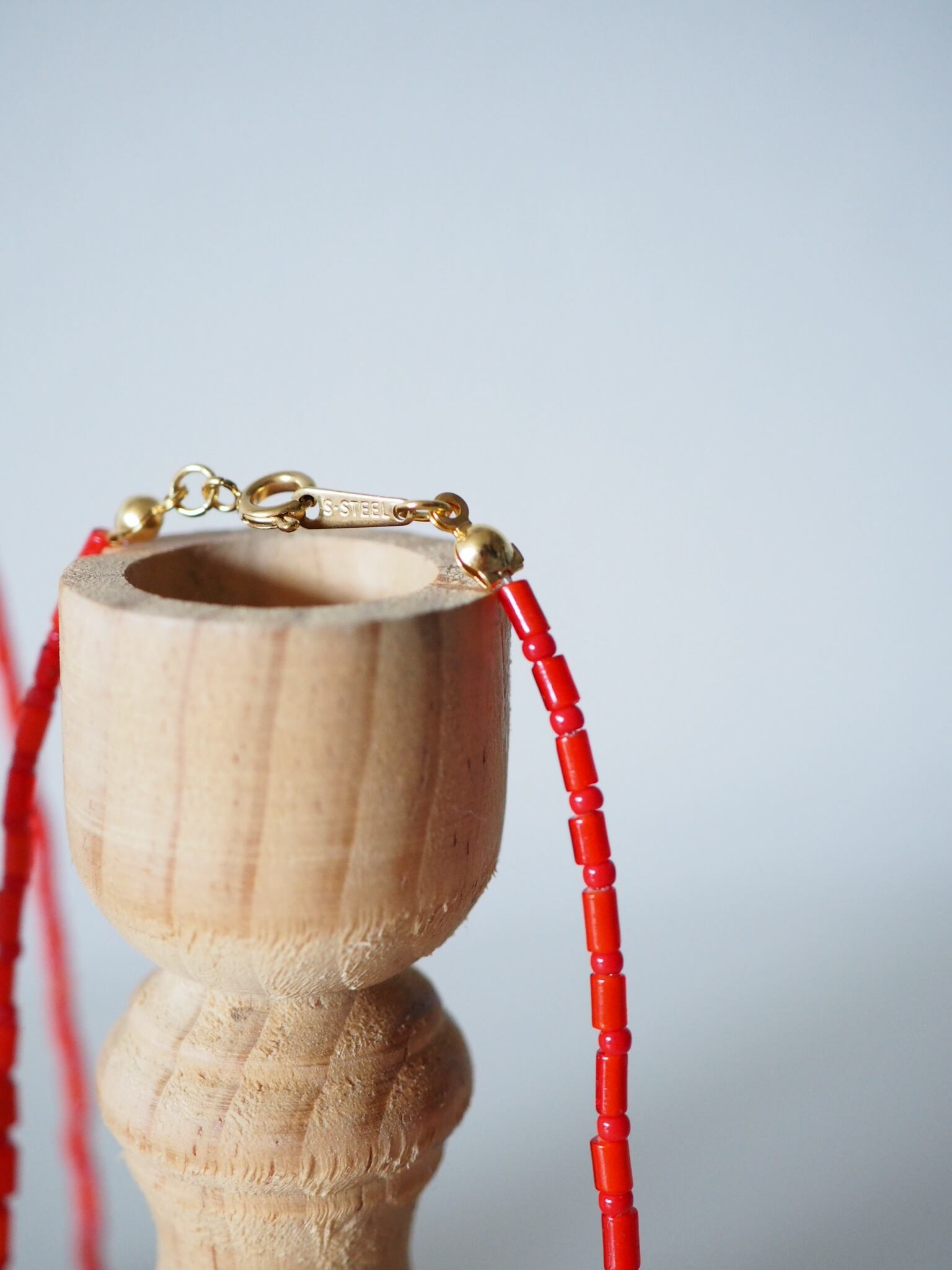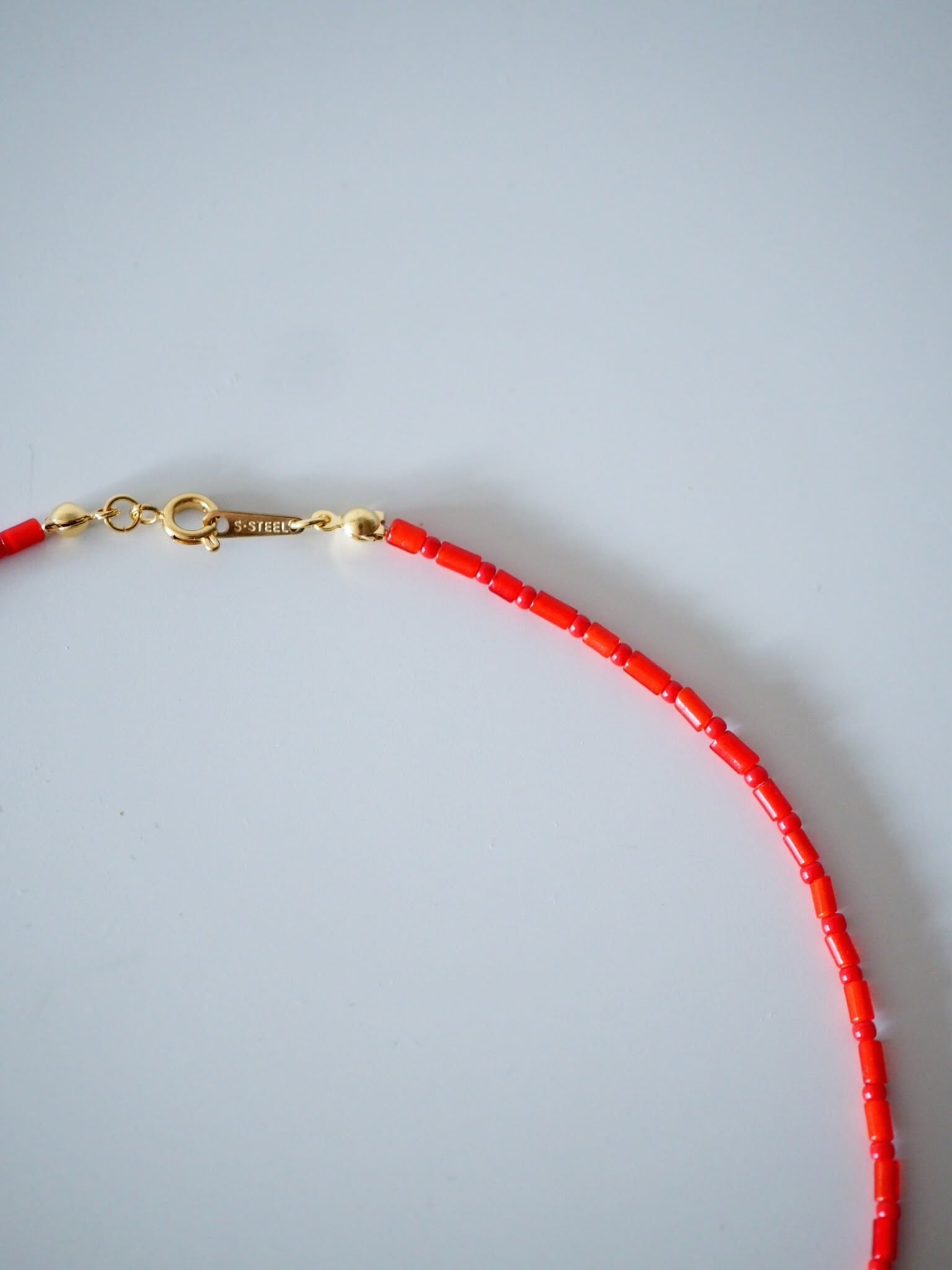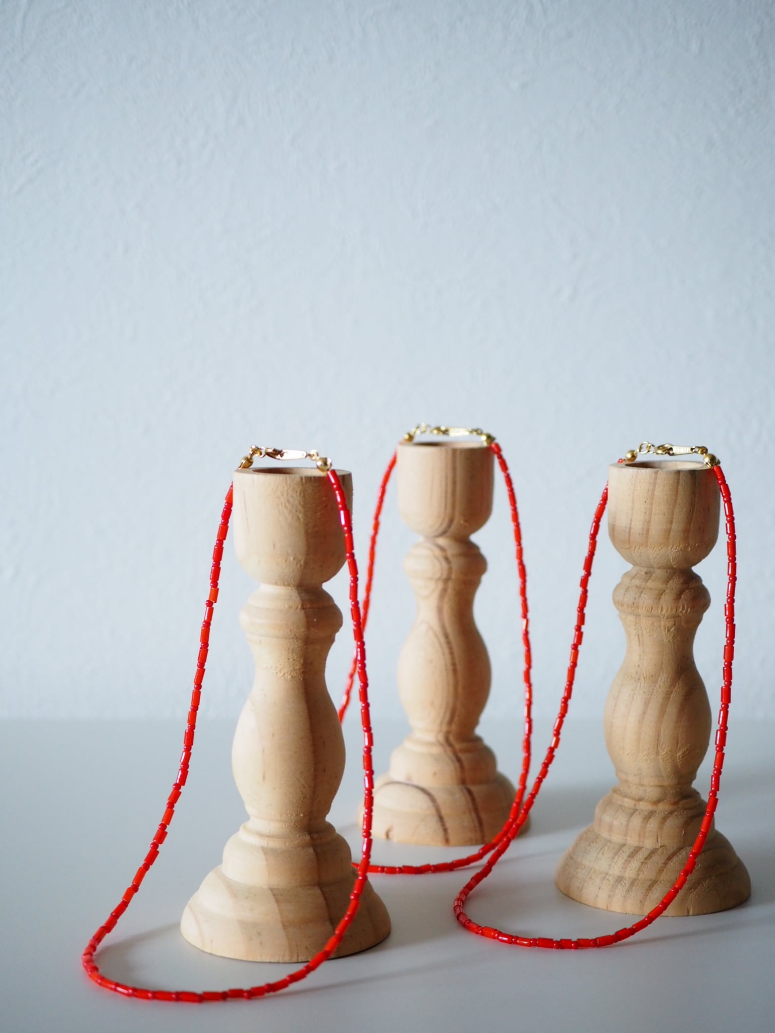 ◎存在感がありながらも繊細な美しさを感じさせる、glass beads necklace (European vintage)です。特徴的な形状を持つヨーロッパヴィンテージのガラスビーズが、朱赤の華やかさであなたの個性を引き立てます。このチョーカータイプのネックレスは、日常使いはもちろん、特別なシーンでも一際目を引くアイテムとなることでしょう。
